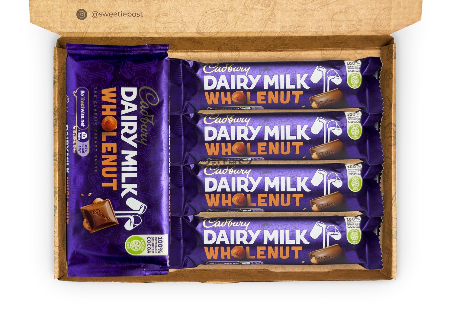 Deliciously creamy Cadbury Dairy Milk chocolate with whole hazelnuts, made with a Glass and a Half of fresh milk.